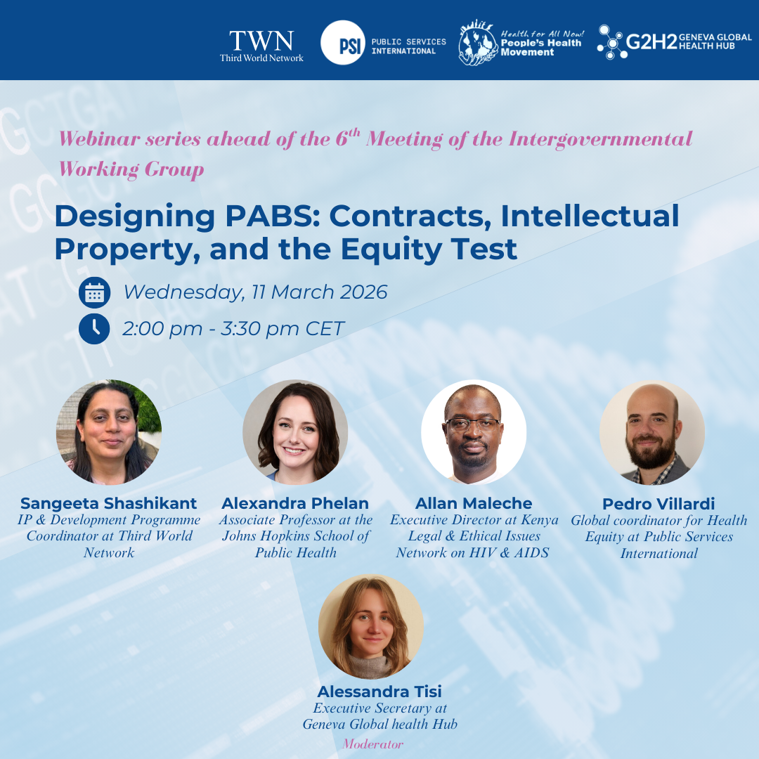 This webinar will explore the implications of a PABS system whereby the sharing of materials and sequence information is largely based on voluntary norms rather than enforceable agreements and the impact of IP monopolies on R&D and access. Bringing together experts in global health law, civil society, public services, the discussion will explore these issues and reflect on how choices made in the negotiations will determine whether the PABS system will deliver accountable and equitable outcomes.