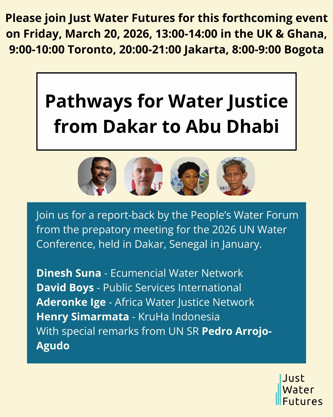 Our webinar is a report-back by members of the People's Water Forum from the preparatory meeting for the 2026 UN Water Conference, held in Dakar, Senegal in January. We will hear insights and perspectives from: