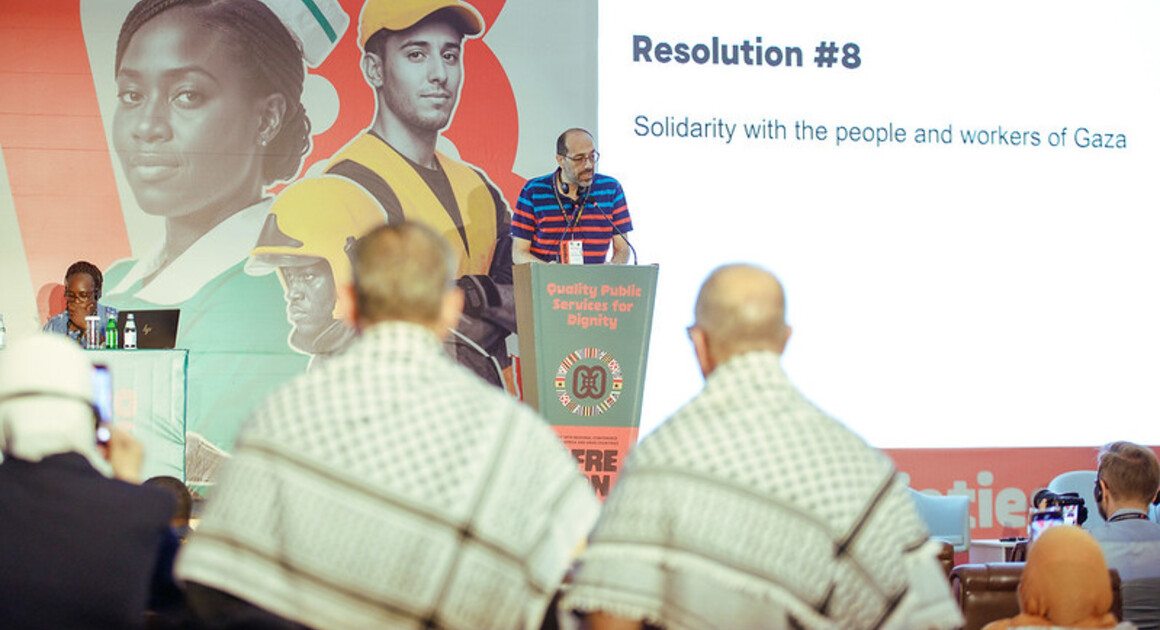 At the 14th African and Arab Countries Regional Conference, PSI affiliates adopted a resolution condemning the Israeli government’s siege, attacks on civilians, and destruction of essential infrastructure in Gaza, calling these actions violations of human rights and potential acts of genocide. They urged the international community to provide unrestricted humanitarian aid, protect healthcare services, investigate war crimes, suspend military support, and mobilise solidarity and material assistance for Palestinian public service workers.