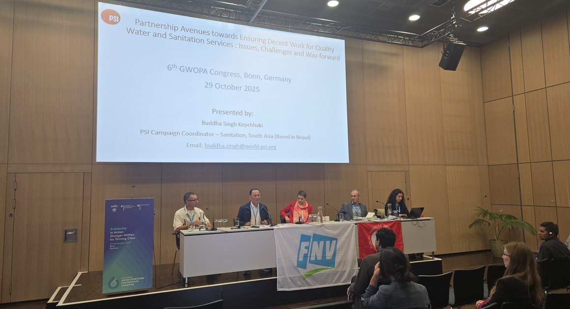 During the panel discussion, Buddha Singh Kepchhaki, PSI's Organiser for sanitation workers in South Asia, told the audience about the working conditions in which informal sanitation workers in Nepal, Bangladesh, Pakistan and India provide this vital service to the community and to the local water utilities. These workers are hired by outsourcing companies which, although paid by municipalities, have largely disregarded their dignity as human beings and workers. PSI is organising them into trade unions - with the support of the its Dutch trade union affiliate, FNV Overheid – to ensure their fundamental human and labour rights are respected.