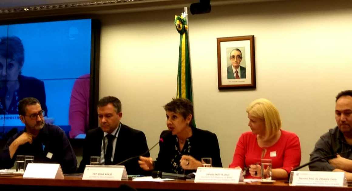 Denise Motta Dau, secretário sub-regional da ISP para o Brasil, voltou a falar com o objetivo de fazer uma síntese da audiência e propor encaminhamentos à Comissão de Trabalho, Administração e Serviço Público (CTASP). Foram três sugestões: a primeira, que a CTASP instale uma subcomissão específica sobre práticas antissindicais no setor público. A segunda, que novas audiências sejam feitas, para que outras entidades sindicais possam contribuir e para que se faça o acompanhamento das denúncias realizada. E a terceira, que a CTASP recomende ao governo, através do Ministério da Economia, que as centrais tenham assento no Grupo de Altos Estudos do Trabalho.