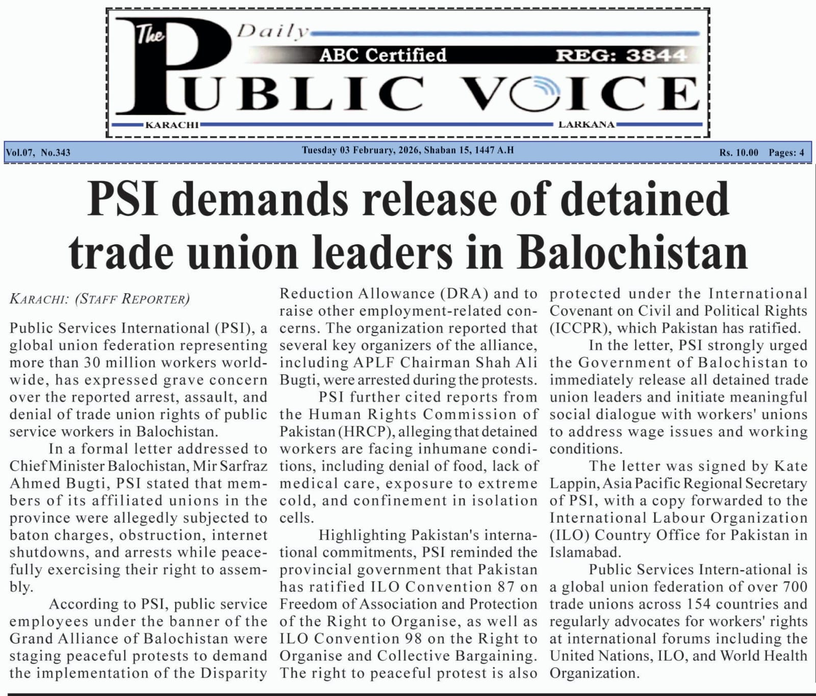 Shah Ali Bugti, Chairman of the All Pakistan Labour Federation (APLF), and other workers were released on Saturday, 7 February, 2026 after PSI's Regional Secretary for Asia Pacific sent a letter to the Chief Minister of Balochistan urging him to release the arrested leaders and workers. The letter also urged the government to engage in social dialogue with the workers for rightful wages and working conditions.