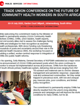 The Trade Union Conference on the Future of Community Health Workers (CHWs) in South Africa brought together unions, CHWs, health experts, and civil society to address the precarious working conditions of CHWs and strategize for their full recognition within the public health system.